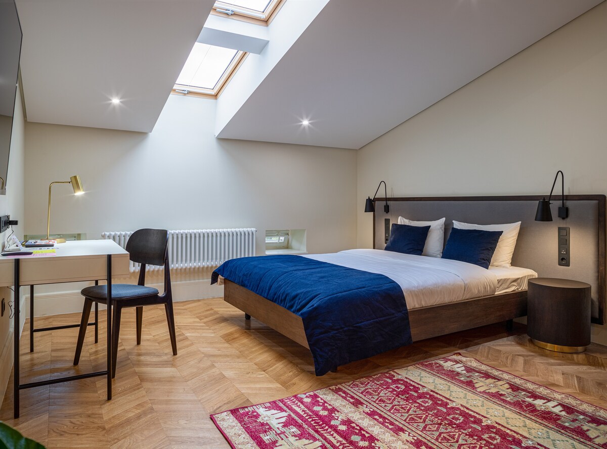 Tolles Zimmer mit neuem modernem Design. Der Blick auf den ruhigen Innenhof passt perfekt zu unserer zentralen Lage direkt am Marktplatz. Es besteht aus einem Schlafzimmer mit einem großen Doppelbett und einem Wohnbereich mit einem Sofa, Couchtisch und Schreibtisch. Zimmer mit allen modernen Annehmlichkeiten wie Klimaanlage, Safe, Bügeleisen und Brett, Minikühlschrank und schickem Badezimmer mit Dusche. Das Hotel verfügt über ein elektronisches Zimmerzugangssystem.