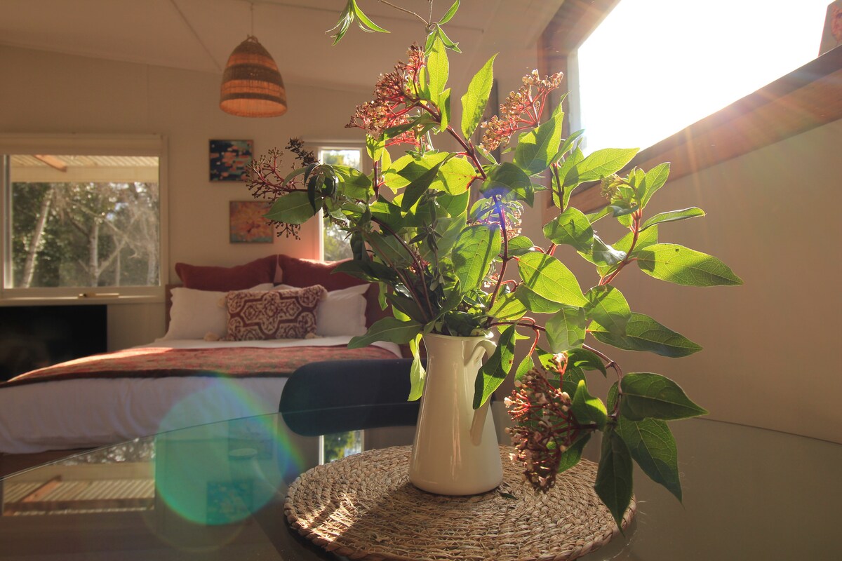 Der perfekte romantische Zufluchtsort. Ein maßgeschneidertes Tiny House unter den Gummibäumen mit Blick auf einen Garten im Landhausstil. Mit Küchenzeile + eigenem Bad + Bett im Loft-Stil hat es alles, was du für eine besondere Nacht brauchst. Mit Feuerstelle + Essbereich im Freien, zusammen mit Holzofen im Inneren ist es perfekt für alle Jahreszeiten. Frühstück mit handverlesenen Eiern, Brot, Milch für Aufenthalte von Freitag bis Sonntag. Das Loft-Bett befindet sich auf einer Leiter. Wir haben Pfauen, Hunde, Mini-Ziegen und Geflügel auf dem Grundstück.
