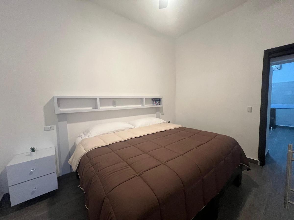 Vollständige Wohnung. Zimmer mit Doppelbett, Mini-Split, 50 MBit/s Internet, HBO, Netflix und Crunchy Roll. Küche mit Herd, Mikrowelle und Kühlschrank. Esszimmer und Sofa. Parkplätze vor dem Haus und Sicherheitskamera. Für deine Privatsphäre ist der Eingang unabhängig und teilt sich die Bereiche nicht mit der anderen Wohnung. Familie und Innenstadt vor dem Haus haben einen Park und Geschäfte und Einkaufszentren in der Nähe. 20 Minuten vom Flughafen, 25 Minuten von der Innenstadt von Mty und 15 Minuten vom BBVA-Stadion entfernt.