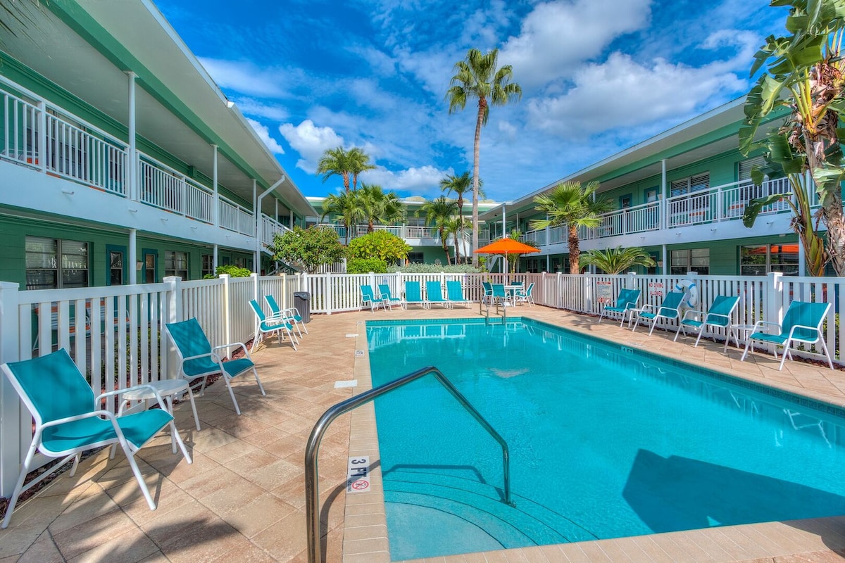 Tropic Terrace Suite #54 – Classic Charm with a Poolside View Studio | 265 Sq Ft | Pool-Facing | 2nd Floor | No Elevator Welcome to Suite #54 at Tropic Terrace Resort, a cozy studio retreat located directly on the pristine sands of Treasure Island. This thoughtfully designed unit blends vintage Florida charm with comfort, offering the perfect spot to relax after a day in the sun.