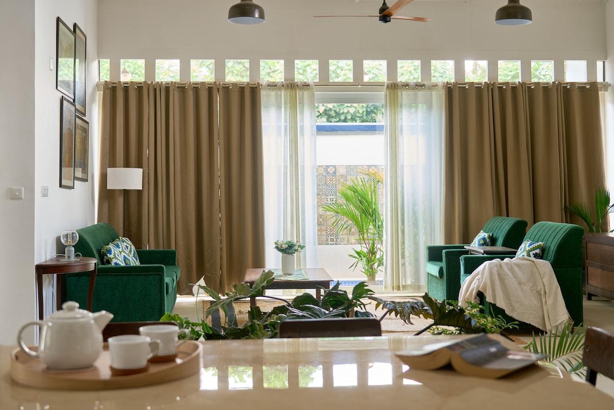 Set in the heart of Coorg, this colonial-style villa blends classic charm with modern comfort. Bathed in soft whites and deep blues, it features vintage furniture, patterned floors, and sunlit nooks that feel warm and welcoming. With three ensuite bedrooms, two common washrooms, and a cozy pool, it’s perfect for couples, families, or small groups seeking a peaceful retreat where timeless design meets homely comfort.