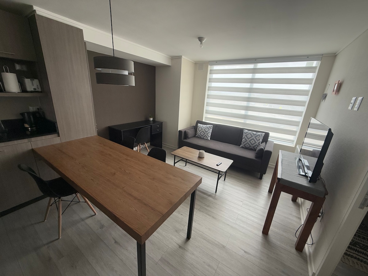 Helle und ruhige Wohnung mit Blick auf die Stadt Punta Arenas und die Straße von Magellan. Wache im Hauptschlafzimmer mit eigenem Bad und einstellbarer Zentralheizung zu einzigartigen Sonnenaufgängen auf. Zweites Schlafzimmer mit einem Ausziehbett für zwei Personen. Ausgestattete Küche, WLAN, Smart-TV und Privatparkplatz. Eigentumswohnung mit Concierge, Grünflächen und Kinderspielen. 5 Minuten vom Einkaufszentrum und der Freihandelszone, 10 Minuten von der Innenstadt und 15 Minuten vom Flughafen entfernt. Ein idealer Ort um sich Ruhe und Erkunden zu geben und zu erkunden.