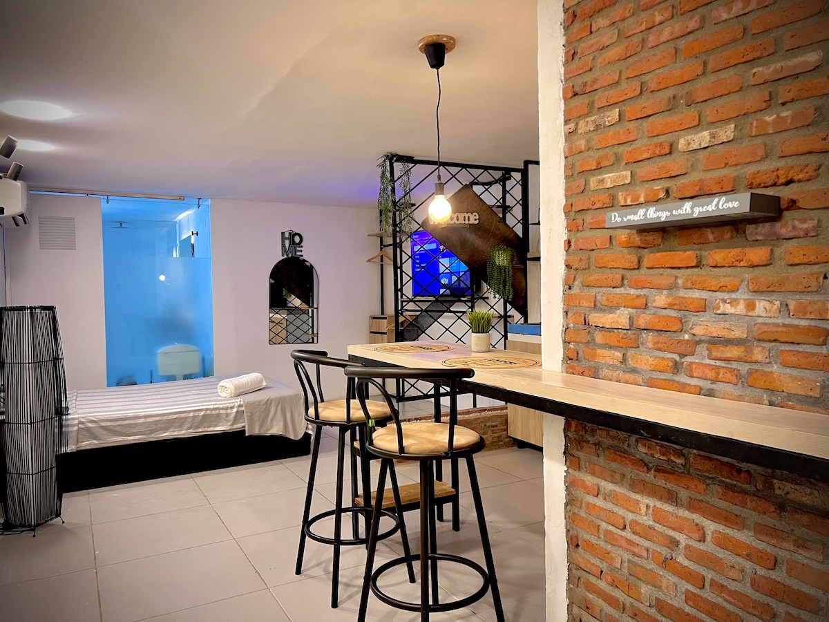 Ein modernes Apartment mit zeitgenössischer Architektur. Es verfügt über eine kleine Terrasse mit einem Schiebedach, ein Zimmer mit einem Kleiderschrank, ein Arbeitszimmer mit einem Doppelbett und zwei Badezimmer. Sichere ruhige Gegend in der Nähe von Parks, Einkaufszentren, Restaurants usw. Parqueadero tagsüber kann da sein, das darfst du nicht. Der Parkplatz am Eingang des Gebäudes, der Wagen bietet Platz für draußen, 3 Meter vom Eingang entfernt.