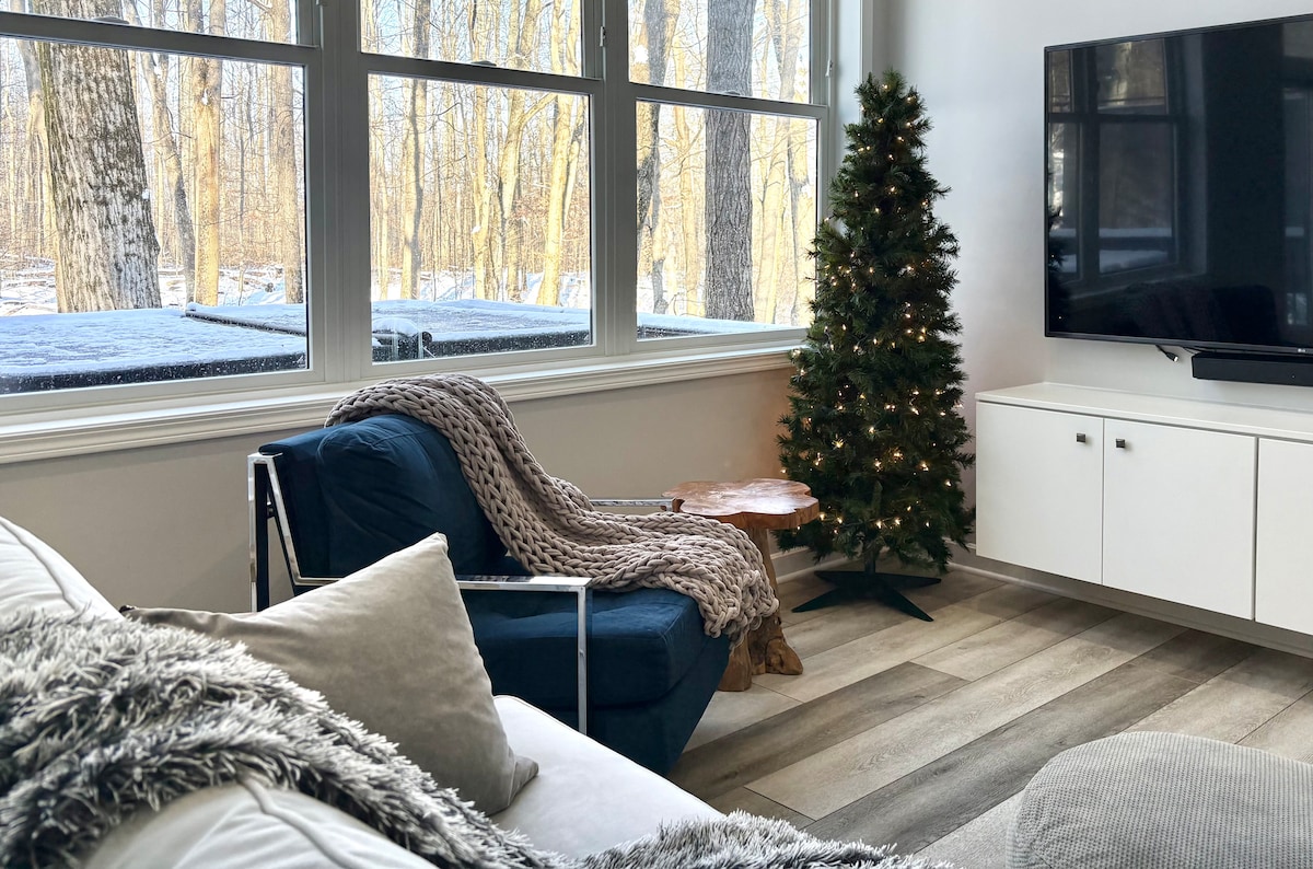 Unser rustikales, von Frank Lloyd Wright inspiriertes, modernes Haus befindet sich auf 10 bewaldeten Hektar inmitten der Schönheit der Natur. Es gibt Wanderwege im Wald zum Wandern und Langlaufen. Die vom Boden bis zur Decke reichenden Glaswände in der Wohnung bringen die Außenwelt herein und die private Terrasse bietet zusätzliche spektakuläre Ausblicke auf den Wald. Wenn du nicht die Wunder der Natur genießt, nutze unsere inklusiven Streaming-Dienste. Wir haben ein brandneues Heiz- und Kühlsystem mit 24-Stunden-Service!