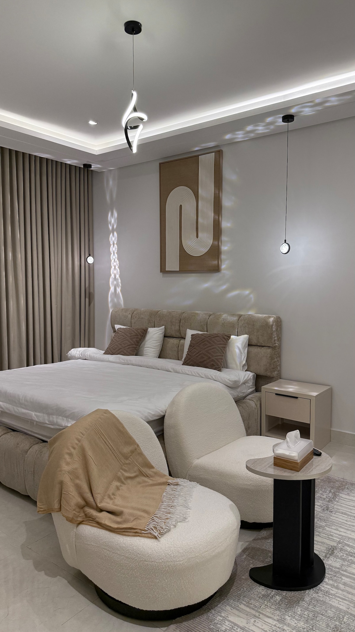 Ein modernes Studio mit einem raffinierten Design, das Komfort und Privatsphäre bietet, mit intelligentem Self-Check-in. Verfügt über ein Kingsize-Bett, elegante Sitzgelegenheiten, einen Massagesessel, eine voll ausgestattete Küche und ein luxuriöses Badezimmer mit Whirlpool. Reinigung im Hotelstil ist auf Anfrage verfügbar. Intelligente Raumnutzung, stilvolle Möbel und beruhigende Akzente. Das Hotel liegt 5 Minuten vom Flughafen Jeddah entfernt. Schnelles WLAN, 75-Zoll-Fernseher, kostenloses Netflix. Ruhiges Gebäude mit Aufzug und Privatparkplatz. Alles, was du für einen perfekten Aufenthalt benötigst.