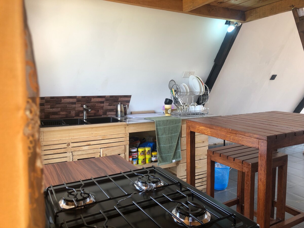 Solarbetriebenes, A-Rahmen-Tiny House am Fuße des Kilimandscharo. Im Inneren findest du eine gemütliche Atmosphäre mit einer kompakten Küche, die für deine Mahlzeitenzubereitungen ausgestattet ist. Die Sitzecke verfügt über eine Schlafcouch und bequeme Sitzgelegenheiten, perfekt zum Entspannen und Genießen der Aussicht. Eine Holztreppe führt zum oberen Loft, wo ein ruhiger Schlafbereich erwartet wird, der einen erholsamen Schlaf gewährleistet. Der Innenwaschraum bietet Komfort während deines gesamten Aufenthaltes. Mit Waschraum im Freien für große Gruppen