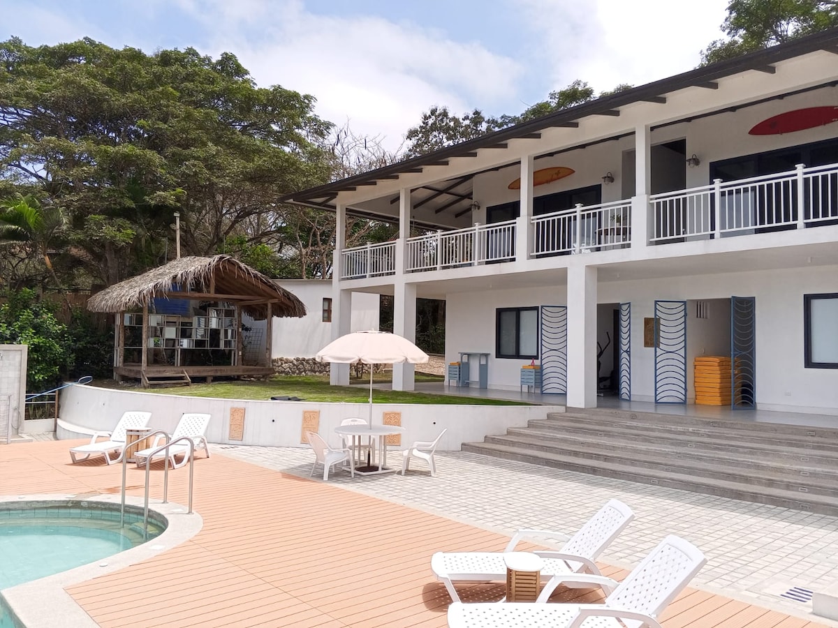 Junior-Suite mit Meerblick, kombiniert Holz mit Bambus, was sie super cool macht, 28 m², sie verfügt über ein Wohnzimmer, Kaffeemaschine, Mikrowelle, Kabel-TV, A/A, Zweisitzer-Hängemattenbett, 1 Etagenbett mit 2 und 1 1/2 Quadratmeter, WLAN, Dusche mit heißem Wasser, 40 Meter über dem Meeresspiegel an einem der besten Strände Ecuadors: Libertador Bolívar, hat Terrasse für geröstet oder Yoga, Taebo und Pilates. Frühstück wird am Strand serviert, wir bieten auch Surfunterricht an. Gesamtpreis 5 Personen: 80 $/Nacht