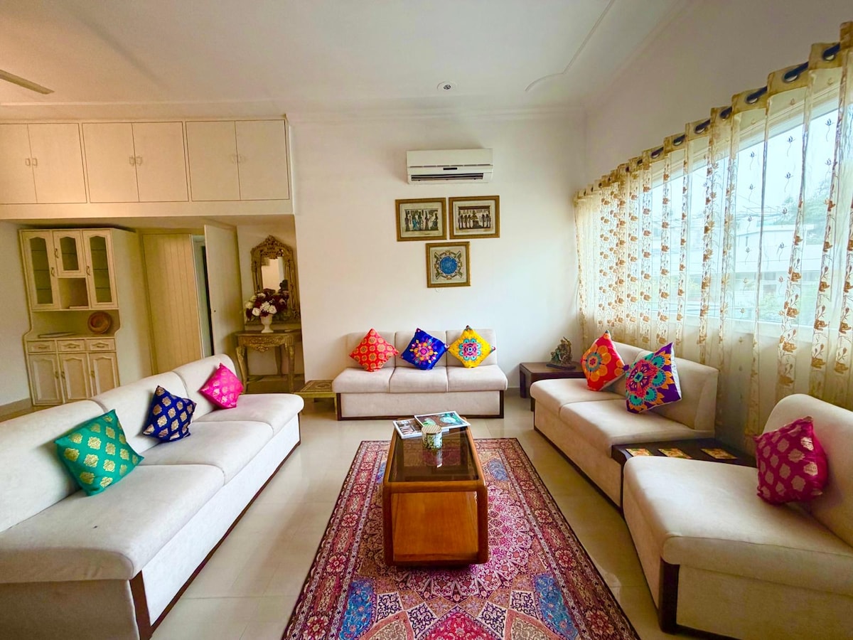 Dieses offene Studio-Apartment folgt minimalistischen Designprinzipien. Ausgestattet mit einer Küchenzeile, zwei Badezimmern, einem Kingsize-Bett in voller Größe, einem Queensize-Wandbett, TV mit Netflix, Hotstar, PrimeVideo, JioCinema und kostenfreiem WLAN, bietet dieser Raum bequem Platz für eine vierköpfige Familie. Bitte beachte: Dies ist eine offene Wohnung und es gibt KEINE privaten Schlafzimmer. Die Wohnung befindet sich im zweiten Stock, sodass du zwei Treppen hinaufgehen musst. BITTE KEINE PARTYS 🙏🏽 und RAUCHEN VERBOTEN 🚭