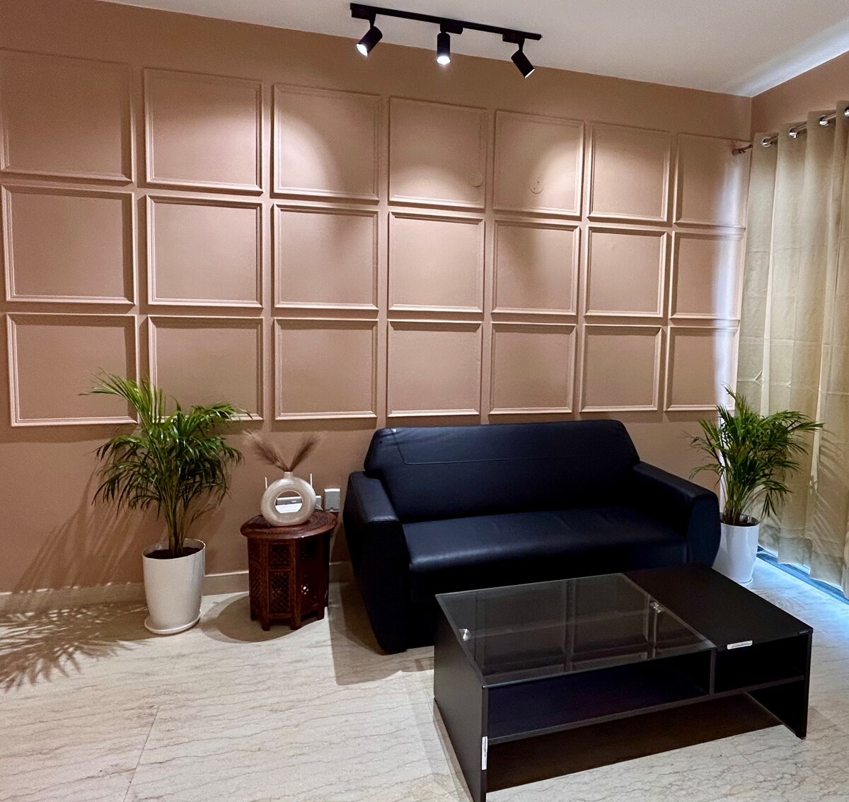 NO PARTIES/ONLY FAMILIES. Paradise Stays- where modern living meets peaceful countryside charm. This stylish 2BHK flat offers a clean, contemporary space with everything you need for a comfortable stay. Located in a low rise building with minimal infrastructure, the apartment opens up to stunning open-field views, perfect for anyone looking to unwind and breathe easy. 15 mins drive from Airport, located just minutes from CP-67 mall, great cafes at District One, yet away from the city’s noise.