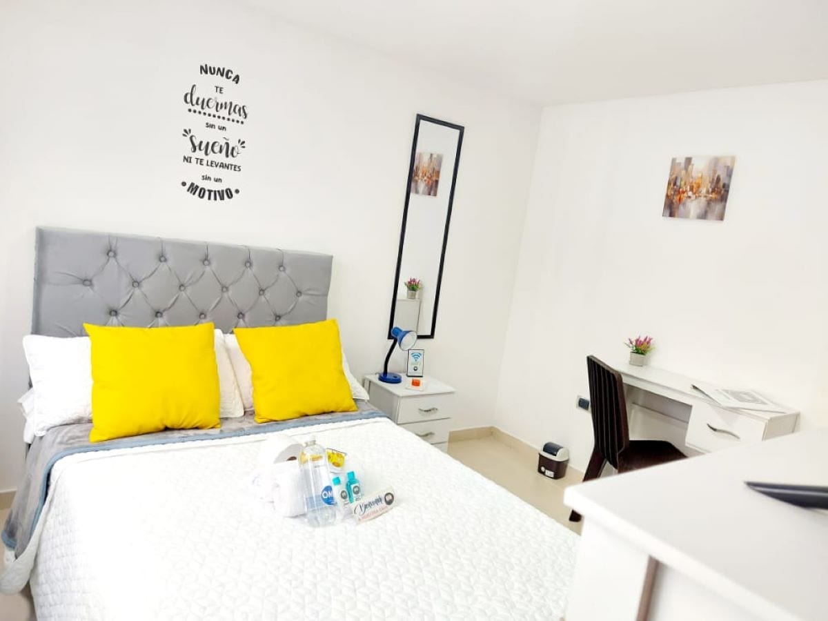 Spektakuläre Einzimmerwohnung im 7. Stock des Gebäudes Urapanes De Bella Suiza in einem der ruhigsten und exklusivsten Viertel der Stadt. Es verfügt über ein komfortables Zimmer mit einem Bett von 1,60 Meter mal 1,90 Meter, 40-Zoll-Fernseher, damit Sie Ihre Lieblingskanäle genießen können. Badezimmer mit Warmwasserdusche, ein komfortables und luxuriöses Zimmer. In der Küche findest du alles, was du brauchst, um deine Lieblingsgerichte zu kochen. Terrasse mit hochmoderner Waschmaschine und Trockner.