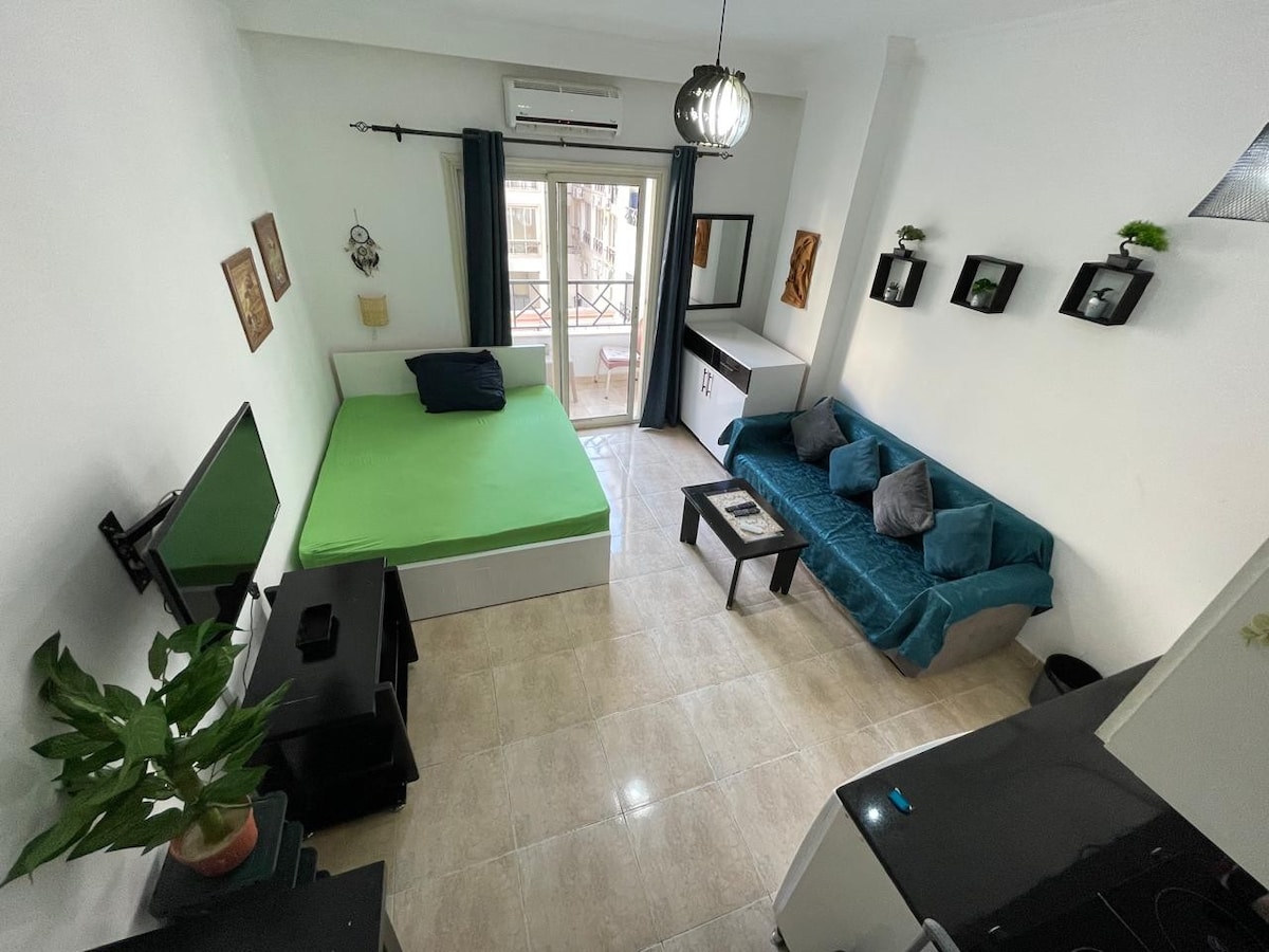 Brand new studio with cozy interior modern furniture , huge balcony and private sandy beach, available 3 pools, sport court . The resort is 10 minutes from Hurghada city center and 10 minutes from Hurghada marina, the airport is 15 minutes far away. Golden beaches and guaranteed sunshine are what made Hurghada famous to spend your holiday. The colourful reefs, amazing corals and tropical fish are among the finest in the world. Your perfect holiday by the sea and sunny weather all year