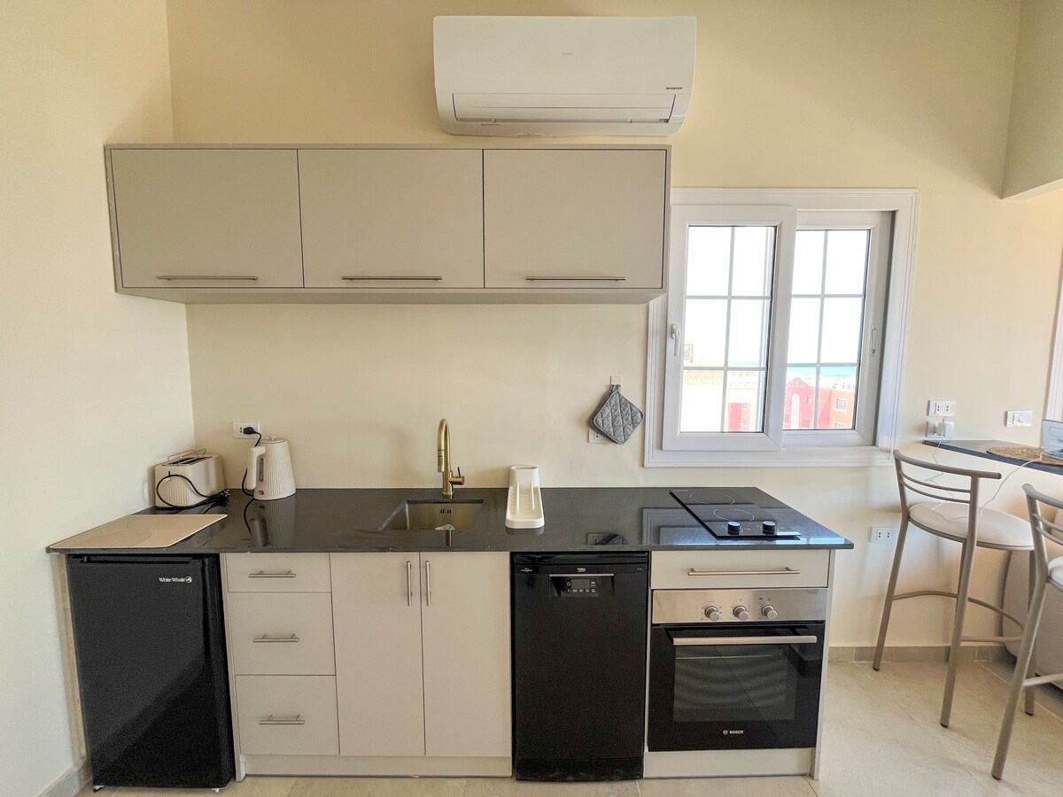 Genieße ein wunderbares Reiseerlebnis in dieser neuen Unterkunft, die aus einem Schlafzimmer mit einem großen Bett, einem Wohnzimmer mit einem Sofa, das als Bett genutzt werden kann, und einem Balkon mit einem schönen Meerblick besteht. Die Unterkunft ist mit allen notwendigen Annehmlichkeiten ausgestattet, einschließlich Klimaanlage und eigenem Internetanschluss. Sie befindet sich direkt am Meer und bietet die Möglichkeit, den Sonnenaufgang zu beobachten. Daneben liegen zwei Strände und eine Promenade mit Blick auf beide Strände. Sobald du das Gebäude verlässt, erreichst du in 10 Minuten oder weniger mehrere Ziele, wie die City Center Mall, eines der größten Einkaufszentren in Hurghada, die Hurghada Marina und die Sheraton Street.