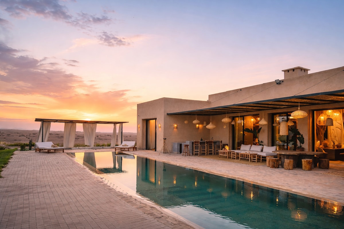 Übernachte in unserer modernen Villa mit 2 Schlafzimmern, nur wenige Minten von Marrakesch entfernt. Entspanne dich am privaten Pool und genieße den wunderschönen Garten mit Aprikosenbäumen. Die Villa verfügt über schnelles WLAN, einen Smart-TV und klimatisierte Schlafzimmer, die jeweils mit einem eigenen Bad ausgestattet sind. Parkplätze stehen zur Verfügung . Es ist weniger als 20 Minuten vom Stadtzentrum und nur 5 Minuten vom Marjane-Supermarkt und McDonald's entfernt. Perfekt für einen ruhigen und komfortablen Aufenthalt!