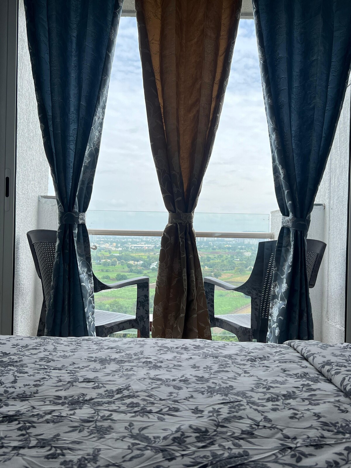 Kein anderes Airbnb in Pune bietet diese Aussicht. Wir haben es überprüft. Von der 23. Etage aus rollt der Golfplatz nach unten, der Pavana-Fluss biegt sich silbern durch das Tal und die Sahyadri-Bergkette hält den westlichen Himmel. Bei Sonnenaufgang färben sich die Berge goldfarben. Nachts leuchtet das MCA-Stadion und die Schnellstraße wird zu einem Fluss aus Licht.