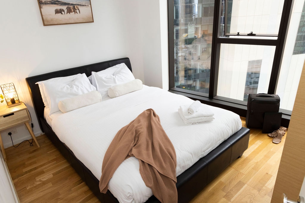 Genieße den Blick auf die Stadt durch raumhohe Fenster in deiner eigenen Wohnung. Dieser moderne Raum bietet Platz für bis zu 4 Gäste, ideal für Paare, kleine Familien, Gruppen von Freunden oder Geschäftsreisende, die einen komfortablen Rückzugsort suchen. Mit Wohnkomfort und zentraler Lage ist es perfekt für kurze und längere Besuche. Die Unterkunft ist nur eine kurze Fahrt von vielen der wichtigsten Sehenswürdigkeiten Melbournes entfernt. Das nahe gelegene Straßenbahnnetz bietet einfachen Zugang zu den berühmtesten Wahrzeichen der Stadt
