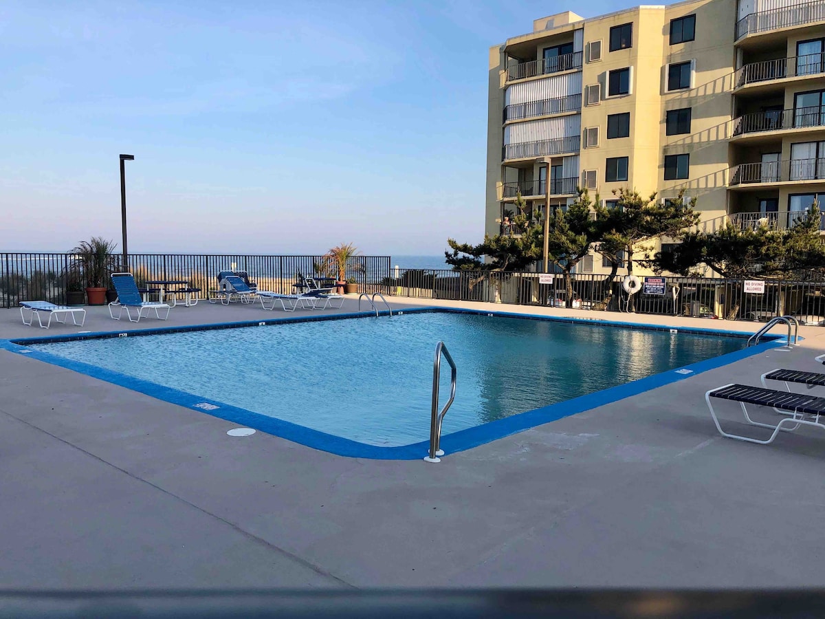 VOLLSTÄNDIG RENOVIERT!!! Ein effizienter Raum in einer TOLLEN Lage für deinen nächsten Strandurlaub! Bei der Ankunft musst du nicht wieder in dein Auto steigen - zu Fuß zu Frühstück/Mittag-/Abendessen/spätabendlichen Treffpunkten, Lebensmittelgeschäften, Minigolf, OC Center of the Arts, Spielplatz, Strand oder Assawoman Bay. Voll ausgestattete Küche für deinen Komfort, wenn du dich entscheidest, zu Hause zu essen. Ein reservierter Parkplatz auf dem Grundstück der Eigentumswohnung. Pool am Meer mit großem Pooldeck aus Beton! Fitnesscenter und Waschküche mit Münzeinwurf.