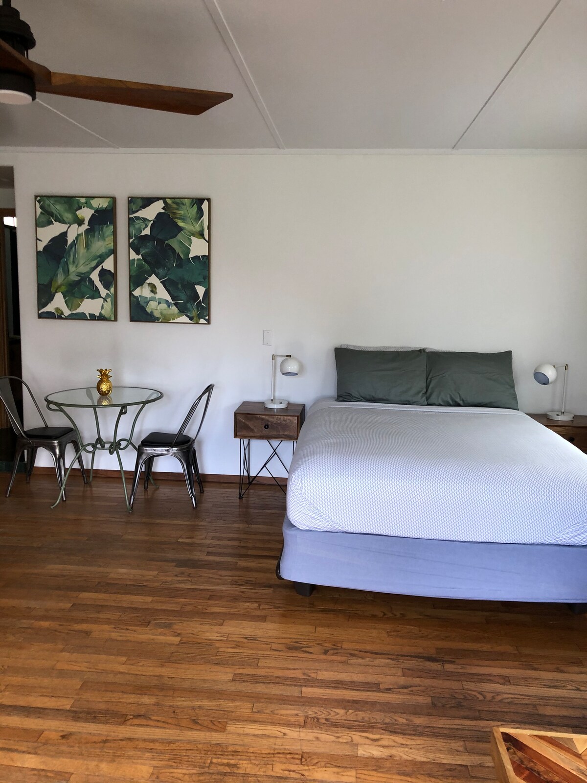 Room 8 is located upstairs. Room 8 is the most secluded of the rooms available Garden and mountain facing, furthest from Hana Road. Featuring a private ensuite bathroom, windows facing the garden and mountains. Room has a Queen bed and the Garden View small sitting room.. Also known as a Honeymoon suite, although 5 and 6 are also ideal and romantic and have Hana Bay views. TAXES, fees and all costs are included in the AirBnB pricing.