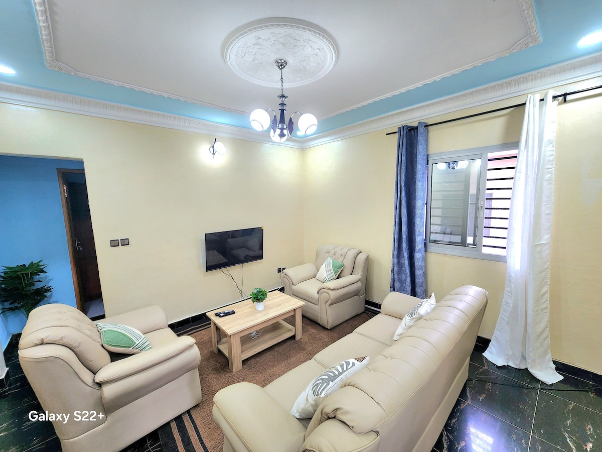 Genießen Sie mit der Familie diese fabelhafte Unterkunft, die 1 großes Wohnzimmer, 2 große Schlafzimmer, 2 Duschen mit heißem Wasser, 2 Balkone,eine große ausgestattete Küche, Sicherheit H24 mit Sicherheitskamera in einer sehr ruhigen Gegend abseits vom Lärm der Innenstadt bietet. 30 Minuten vom Flughafen NSI, 30 Minuten vom Stadtzentrum entfernt. Putzfrau zur Verfügung .