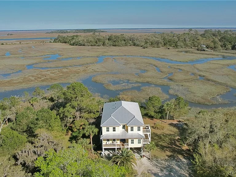 Charmante Küstenhütte mit Blick auf den Sumpf. Dieses luftige Ferienhaus ist die perfekte rustikale Küstenmischung. Es gibt ein sofortiges entspanntes und einladendes Gefühl, wenn du mit einem weitläufigen Blick über das Marschland des Mündungsgebiets begrüßt wirst. Nur wenige Minuten von einer Bootsrampe, der Sapelo Island Ferry, Darien, Butler Island und Shellman Bluff entfernt, macht es das Marsh House einfach, die Erholung und Geschichte der Gegend zu genießen. Bring dein Boot mit! Genieße die Feuerstelle und die große Veranda, während du die Seevögel über dem Sumpf beobachtest.