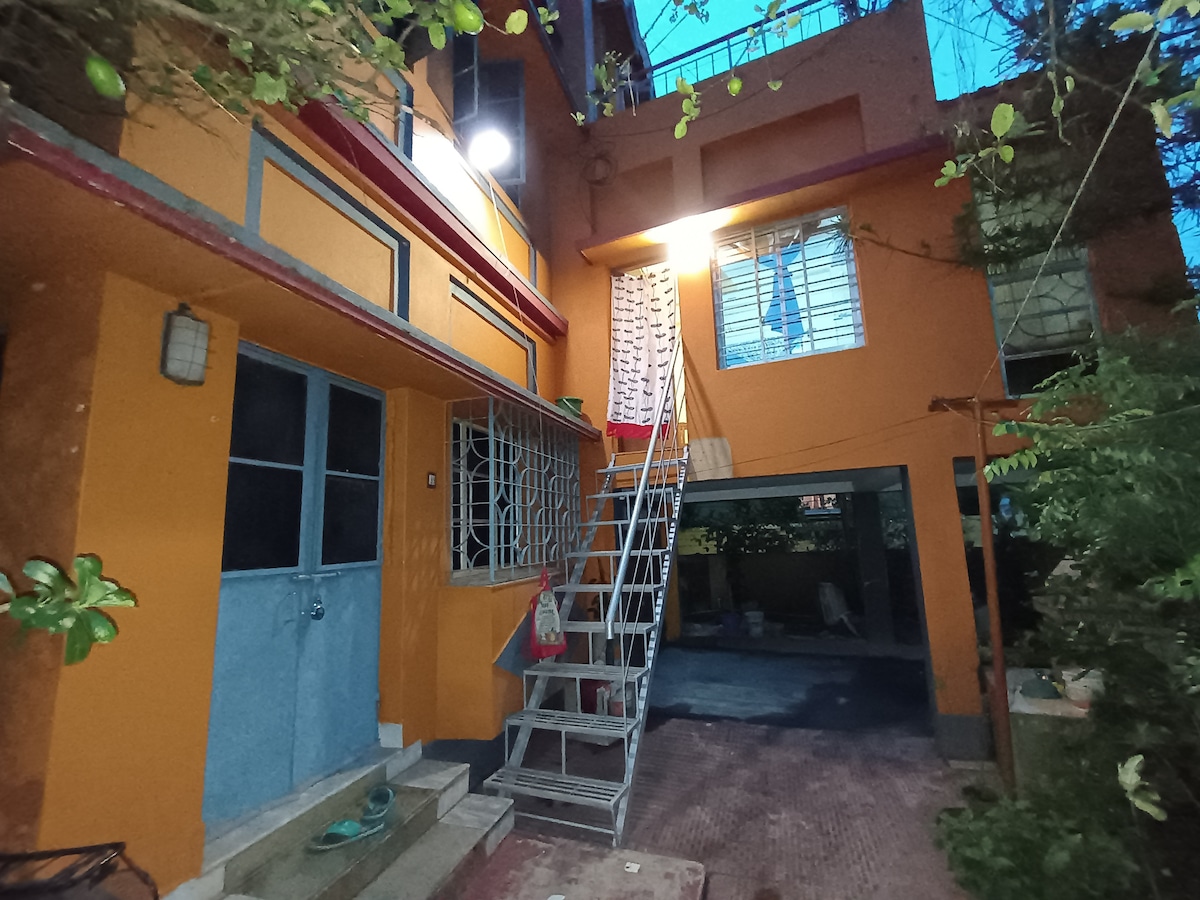 GANZ PRIVATE, SAUBERE UND DESINFIZIERTE, KLIMATISIERTE SCHLAFZIMMER, GERÄUMIG, LUFTIG, 2-STÖCKIGER 3 BHK-BUNGALOW MIT GARTEN, TERRASSE, VERANDA, TERRASSE, ALLE MAHLZEITEN, PERSÖNLICHES TOTO. In einem ruhigen, grünen Viertel im Herzen von Santiniketan, nur wenige Minuten vom berühmten Deer Park und dem edlen Preisträger Dr. Amartya Sen's Haus entfernt, bietet unser Haus den Komfort moderner Annehmlichkeiten sowie den Charme eines rustikalen Urlaubs inmitten der Natur.