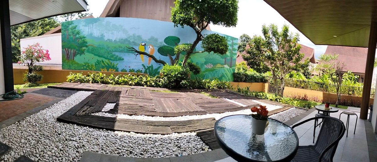 Entfliehe der Stadt in dieses private tropische Haus mit atemberaubendem Bergblick. Genieße geräumige Zimmer mit großen Fenstern, einer großen Terrasse, einem Essbereich im Freien, einem Billardtisch und schnellem WLAN. Perfekt für Familien, Paare oder Fernarbeiter. Umgeben von Natur, mit großzügigem Parkplatz und sicherer Videoüberwachung. Einfacher Zugang über die alternative Puncak-Route - dein friedlicher Rückzugsort wartet auf dich!