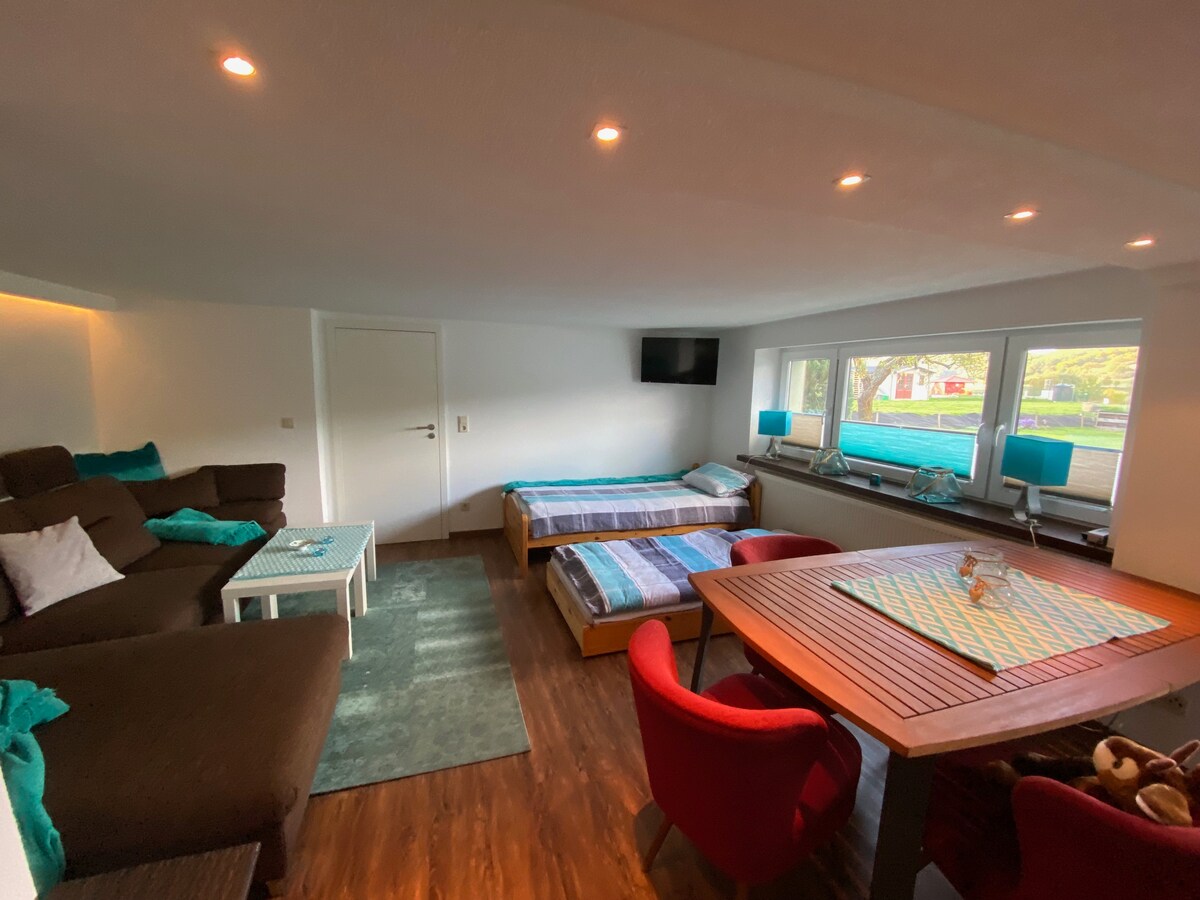 Liebe potenzielle Gäste: Ob auf der Durchreise, für eine kleine Auszeit oder aber für länger - unsere Wohnung ist schnell erreichbar und ein guter Ort, um abends zu entspannen - z.B. auf dem Balkon mit Weitblick. Das Schlafsofa im Wohnzimmer ist sehr bequem, sodass man gut in zwei Räumen schlafen kann. Im Ort gibt es ein schönes Freibad und gute Gastronomie - drumherum viel Wald. Unser Café hat wochentags ab 6 bzw. am Wochenende ab 7 Uhr Frühstück.