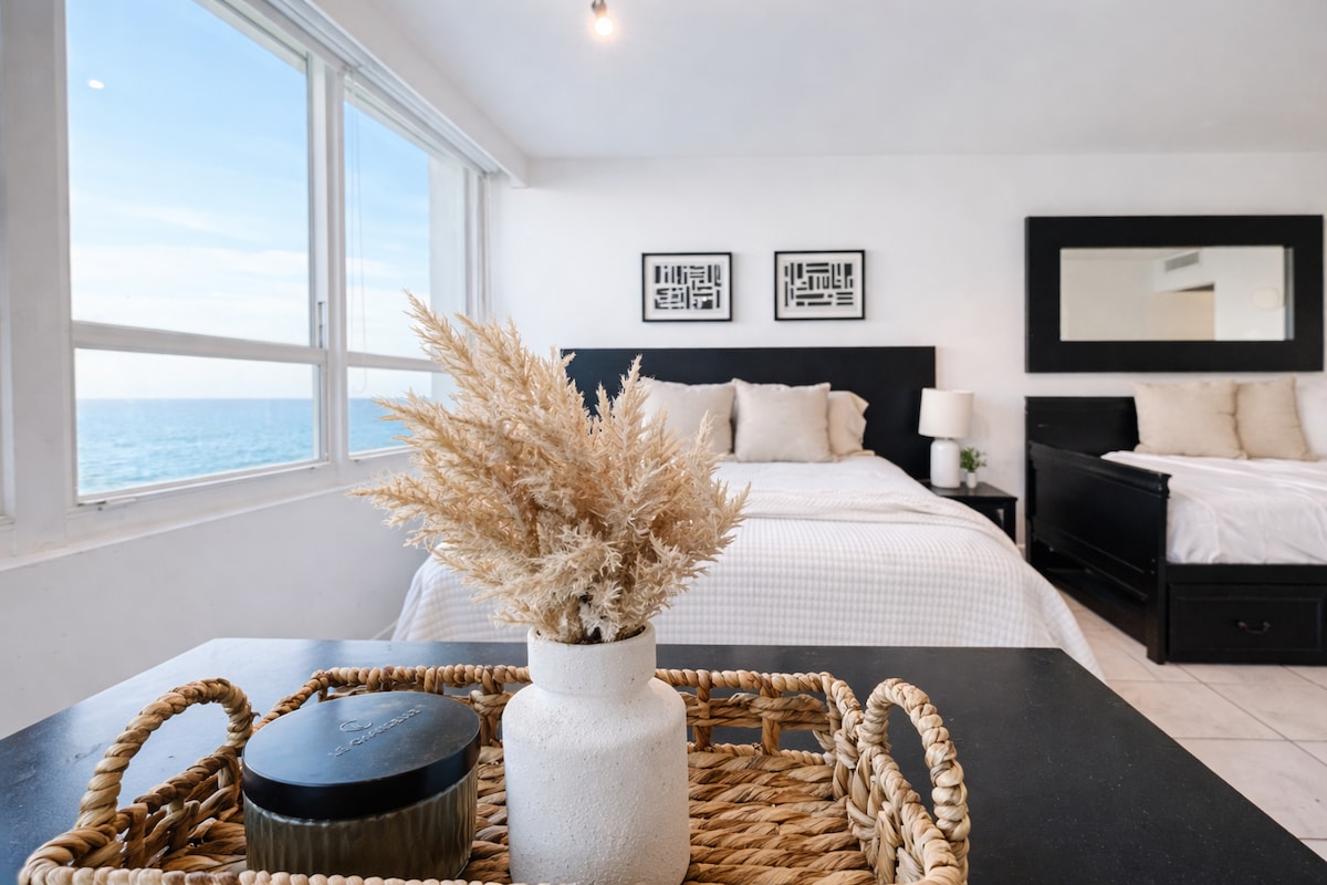 Willkommen im Pure Miami Beach! Entfliehe diesem modernen Studio am Strand im sonnigen Miami Beach, Florida, mit atemberaubendem 180° Meerblick. Entspanne dich in einem gemütlichen Kingsize-Bett, streame auf einem 65-Zoll 4K-Samsung-Fernseher oder arbeite mit privatem 300 MB WLAN und Ethernet-Verbindungen. Bleib fit im renovierten Fitnessraum und entspanne dich dann am funkelnden Pool mit direktem Strandzugang, Liegestühlen und einer Tiki-Bar für tropische Getränke und Häppchen. Kostenlose Parkplätze, luxuriöse Oberflächen und endlose Meeresatmosphäre machen dies zum ultimativen Kurzurlaub!