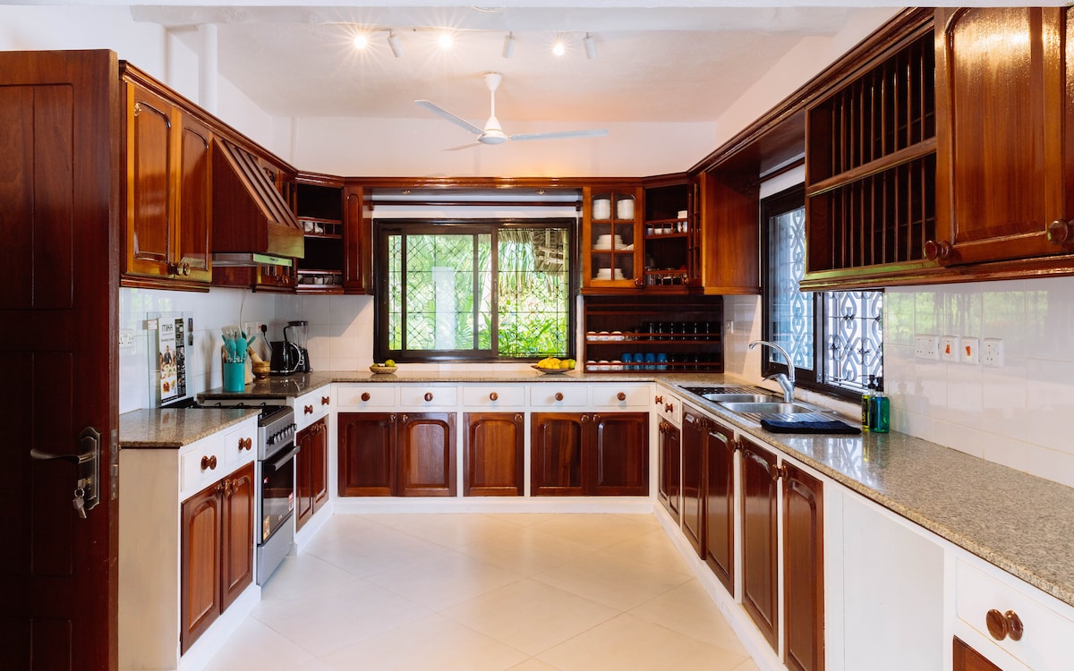 KOCH, HAUSWIRT UND REINIGUNGSDIENST INKLUSIVE Exklusive Villa mit engagiertem Personal, umgeben von viel Grün, nur 400 Meter vom kenianischen Meer und Korallenriff entfernt. Verteilt auf zwei Etagen, verfügt es über einen Swimmingpool mit Sonnenterrasse, Liegestühlen und einem Pavillon für Mahlzeiten im Freien. 3 geräumige Schlafzimmer mit Kingsize-Betten, Moskitonetzen, eigenen Badezimmern, Ventilatoren und Kleiderschränken. Voll ausgestattete Küche, Parkplatz und Selbstversorgung mit Wasser, Strom und Gas. Herzliches, professionelles Personal sorgt für einen unvergesslichen Aufenthalt.