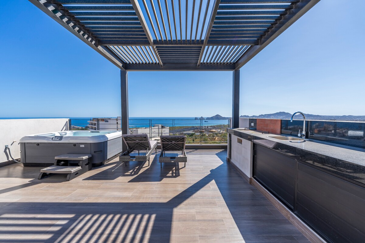 Epic views from every direction! You will be blown away by the beauty of Baja California Sur from this brand new, elegant, and fully appointed apartment. Enjoy coffee on the deck while watching the sunrise over the mountains. After your day surfing and swimming on Cerritos beach (just minutes away by foot or car) relax in the hot tub while the sun is setting over the Pacific. With unobstructed views from every angle you are guaranteed to see whales breach during season. More privacy than condos