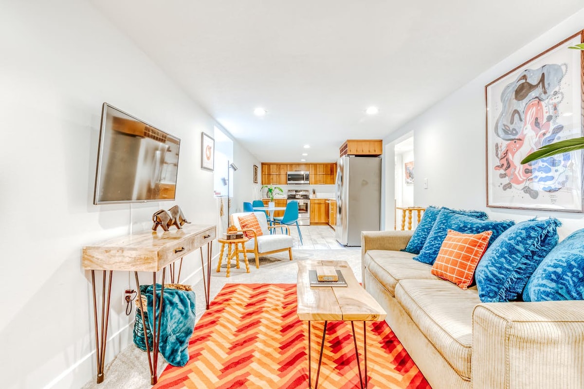 Gemütliche Einzimmerwohnung im Untergeschoss in ruhiger Nachbarschaft. Queensize-Bett. Dekoriert mit Kunst von meinen Reisen in die Türkei, nach Kolumbien, China und Ägypten mit Beschreibungen im AirBNB-Ordner. Kein Herd, aber kleiner Kühlschrank, Mikrowelle und Toaster und Waschbecken. Schrank mit Tellern, Tassen und Besteck. Brett- und Kartenspiele im Schrank unter dem Fernseher. Hulu, Netflix und Prime Video für deine Unterhaltung. Eigene Waschmaschine mit Trockner in der Einheit.