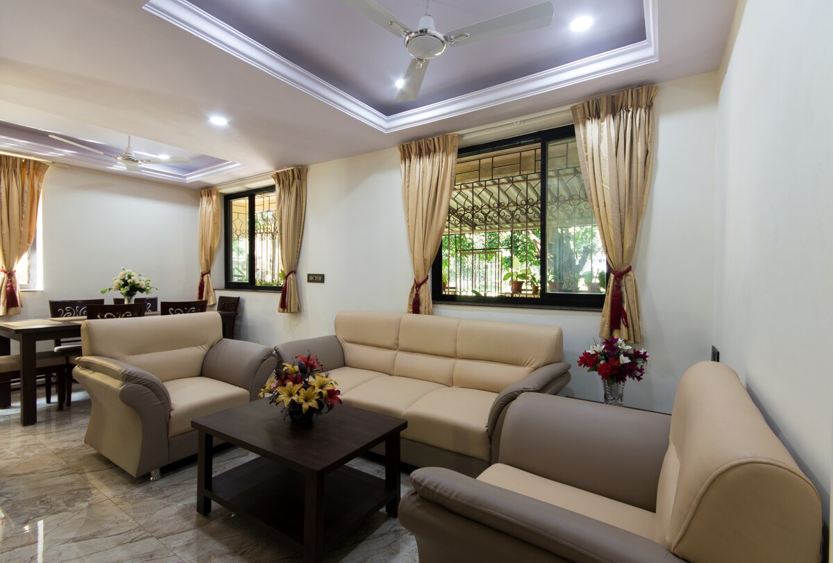 Ein versteckter Juwel in Panjims schickster Postleitzahl. Unser 2BHK-Penthouse verfügt über eine private Terrasse und ist nur einen kurzen Spaziergang vom Strand Miramar entfernt. Ein von Grün umgebenes Goan-Schutzgebiet; das offene, weitläufige Wohnzimmer verwandelt sich nach Sonnenuntergang in einen schicken Raum mit Designer-Ambiente-Beleuchtung. Die berühmte Promenade, Supermärkte und Cafés sind nur einen Spaziergang entfernt. Fontainhas & Casinos sind nur eine kurze Autofahrt entfernt. Genieße Highspeed-WLAN, wenn du von zuhause aus arbeitest. PS: Halte morgen früh nach Pfauen Ausschau!