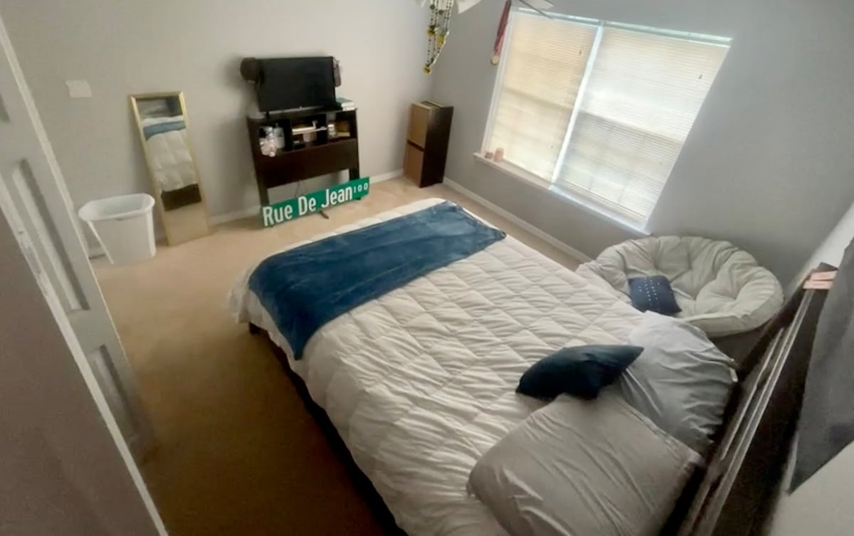 Geräumige Studio-Wohnung mit 10 Fuß hohen Decken und hohen Fenstern, die sie hell und luftig machen. Die Unterkunft liegt in einer ruhigen, bewaldeten Gegend, nur eine 10-minütige Fahrt vom Campus oder dem Platz entfernt. Queensize-Bett, Zweiersofa, Schreibtisch, Stehtisch, Waschmaschine/Trockner und Küche mit großem Kühlschrank, Mikrowelle und Herd. Private, eingezäunte Außenterrasse. Personalisierter Türschloss-Code für zusätzliche Sicherheit. Roku-TV und kostenfreies WLAN.