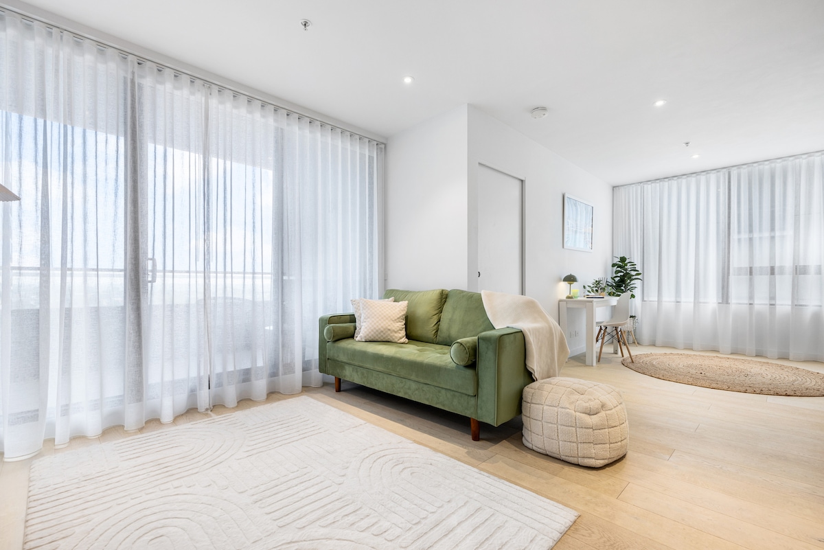 This stylish one-bedroom apartment is located in the heart of Moonee Ponds, offering convenience and comfort for both business and leisure travellers. You’ll be steps away from the Moonee Valley Racecourse and Queens Park, restaurants, and public transport to the CBD (trams, trains and buses). Melbourne Airport is a short drive away. Relax in the living area, complete with a dedicated work station and high-speed internet. Or enjoy a good night's sleep in the king size bed!