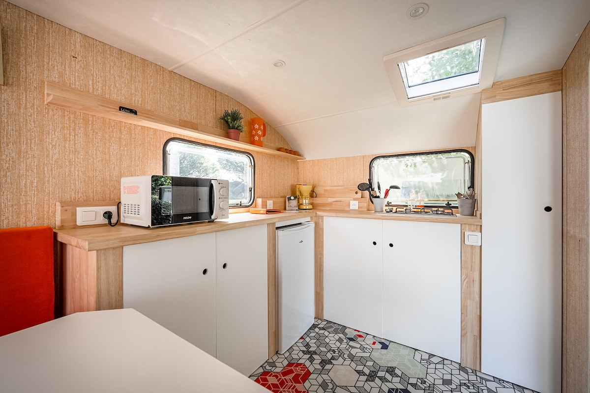 Schlicht und anspruchsvoll, modern und Vintage zugleich, ist unsere Karravane ein EINZIGARTIGES Modell. Sie werden nicht zwei wie sie sehen! Eine funktionale und schlichte Einrichtung mit dem Geist der Siebziger, die an das Alter seines gut erhaltenen Tierkörpers erinnert. Für ein Wochenende zu zweit außerhalb der Saison oder für eine längere Pause im Sommer werden Sie sich zwangsläufig in diesen "alten" Wohnwagen und sein unkonventionelles Konzept verlieben.