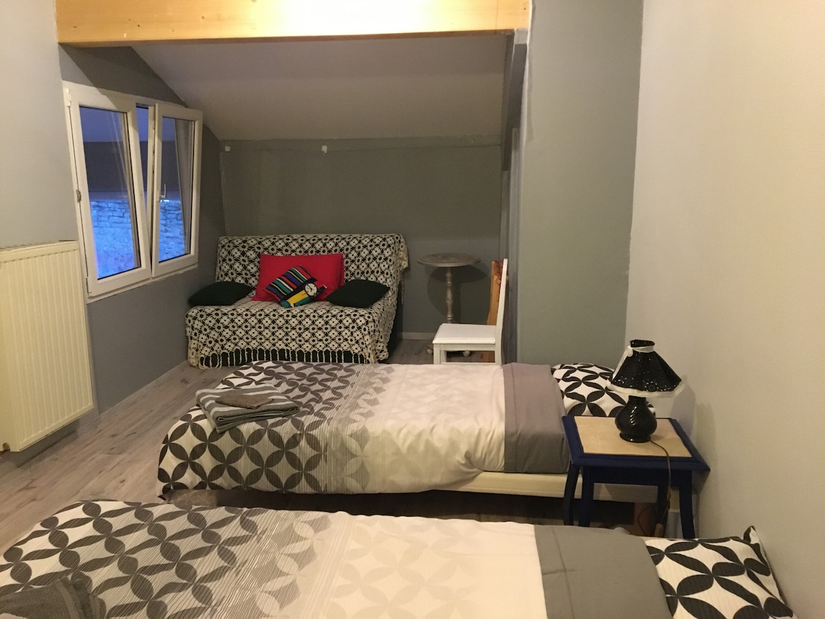 In einem ruhigen Dorf zwischen Metz und Nancy, 7 Minuten von der Autobahn A31 entfernt. Die 2 Schlafzimmer befinden sich im ersten Stock unseres Hauses und sind miteinander verbunden. Eines verfügt über ein 160 x 200 cm großes Bett + Arbeitsbereich. Das andere Schlafzimmer verfügt über 2 Einzelbetten 90 x 200, ein Schlafsofa, das in ein Bett 80 x 190 umgewandelt werden kann, Babybett auf Anfrage (Zuschlag 10 €) Die Zimmer haben Zugang zu einem Badezimmer mit Dusche und separatem WC. Max. 5 Personen + 1 Baby. Abendessen und Frühstück gegen Aufpreis nach Reservierung