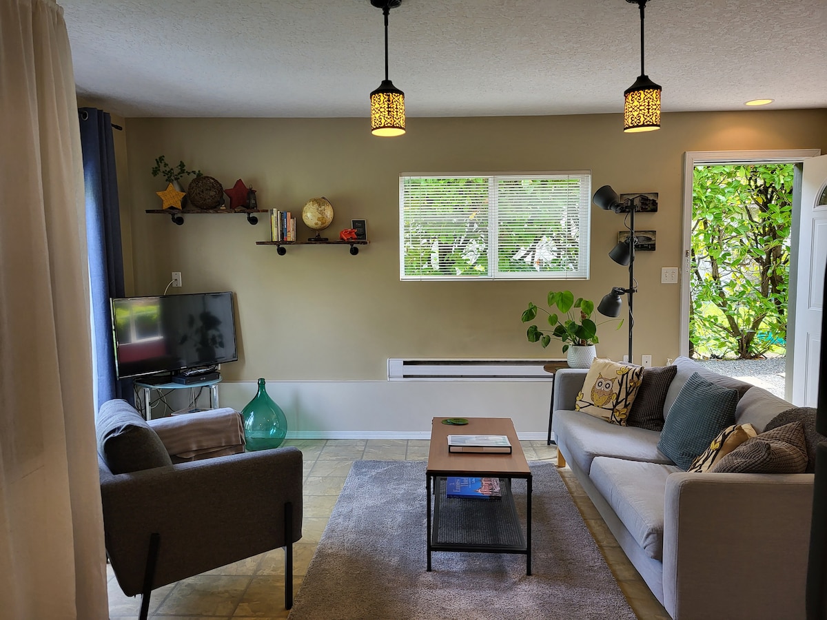 Entspanne dich in deiner privaten Suite mit einem Ausgang auf der unteren Ebene unseres Familienhauses, eingebettet auf 2 Hektar neben dem Elk Lake Park. Zentral gelegen, sind wir 15-20 Minuten von der Fähre, dem Flughafen und der Innenstadt, 10 Minuten von den Butchart Gardens und 5 Minuten von tollen Wander- und Radwegen entfernt. In der Nähe findest du charmante Bauernhöfe und Restaurants. Die nächste Bushaltestelle ist 2 km entfernt. Deine Suite verfügt über einen Kühlschrank, eine Mikrowelle, eine Keurig-Kaffeemaschine und einen Wasserkocher für die Zubereitung einfacher Mahlzeiten. Bitte keine Raucher- oder Duftprodukte!