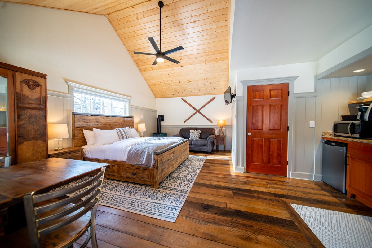 Dein 14 x 14 großes, separates, möbliertes Studio ist angenehm, gemütlich und ruhig. Sie ist mit einer Kaffeekanne, einem Teekessel, einem Toaster, frischer Bettwäsche, flauschigen Handtüchern und einem bequemen Queensize-Bett ausgestattet. Links von der Residenz und an die Werkstatt angeschlossen, erwartet dein Studio deine Ankunft. Die parkähnliche Terrasse bietet einen schönen Bergblick. Das Willkommensbuch wird dein Leitfaden für Aktivitäten in der Nähe des Siskiyou Lake mit Wandern, Radfahren, Golf und Restaurants sein. Es ist 2 Meilen in die Stadt. Biege links in die Einfahrt zu deinem gemütlichen Studio ein.