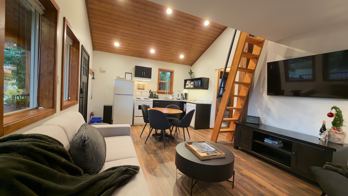 Genieße den gleichen Komfort wie zu Hause auf kleinem Raum. Schlafe tief auf einem bequemen Queensize-Bett, genieße die Ruhe, die Sayward bietet. Loft-Schlafzimmer, begrenzter Kopfraum und steile Treppen. Koche dein Essen, Kühlschrank, Grill, Kochplatte, Kaffeemaschine, Mikrowelle, Toaster stehen zur Verfügung. Die überdachte Veranda schützt vor Regen und Sonne, entspanne dich drinnen oder draußen und genieße das WLAN. Sieh dir einen Film im Bett an oder geh auf die Wanderwege durch die Hintertür, Angelausflüge sind auf Anfrage verfügbar, Salmon River Tubing, Kelsey Bay und vieles mehr