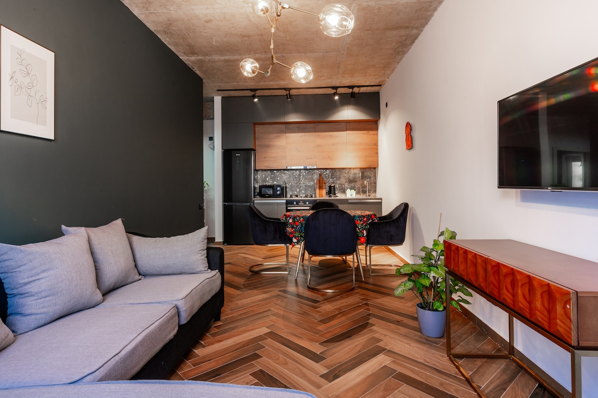 Eine Design-Projekt-Wohnung mit hohen Decken (3,5 m), einem großen Badezimmer, einer voll ausgestatteten Küche, einem Arbeitsbereich und einer Sitzecke wird durchdacht, um den Aufenthalt angenehm und unvergesslich zu machen. Die Wohnung liegt im Zentrum von Tiflis in der sogenannten „Old Tiflis“ Gegend vor dem Staatskanzlei und ist 5 Gehminuten vom Freiheitsplatz entfernt. Das Apartment befindet sich im Erdgeschoss tief in einem ruhigen Innenhof und verfügt über einen privaten Eingang. Der Bereich vor der Wohnung steht rund um die Uhr unter CCTV-Steuerung