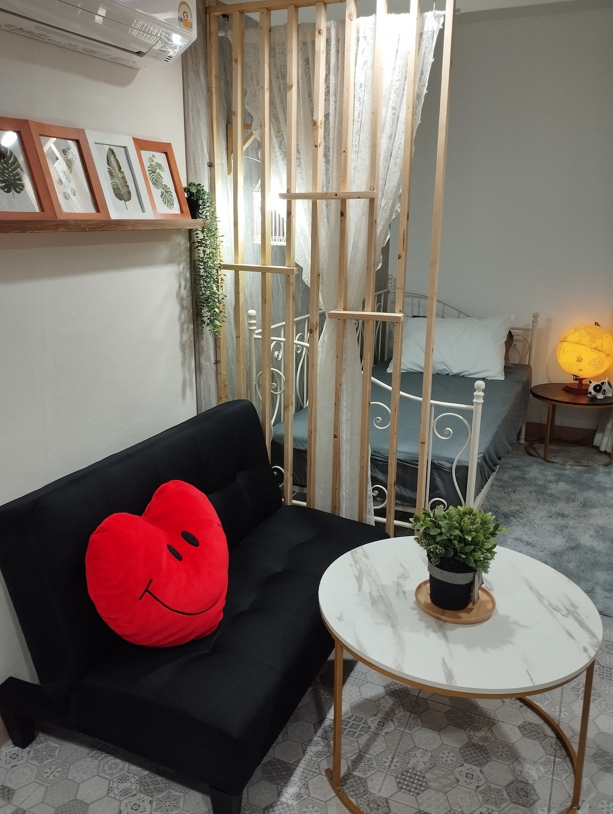 Das Zimmer ist ein Ein-Schlafzimmer mit einer Wohnzone, wie Kühlschrank, Klimaanlage, TV, Mikrowelle, Reiskocher, Schlafsofa, TV, Schlafsofa zum Fernsehen, Wasserkocher, Waschbecken, Dampfbügeleisen, Staubsauger, Haartrockner, Suki-Kessel und Lebensmittelmixer, Aufbewahrungstheke mit Regal, Schuhaufbewahrung, Ausstellungsregal, brennbare Box, Vorhänge mit Glaswand, Geschirr, Messer und Bettwäsche, Bettwäsche, Kissen, Decken. WLAN: sorawis Passwort: 12345678
