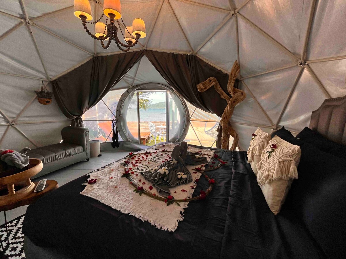 Genieße Familienurlaub mit diesen geräumigen 2 Glamping-Kuppeln mit eigenem Bad und großem Swimmingpool im tropischen Garten. Die Kuppel ist mit Details für ein luxuriöses und dennoch charmantes Gefühl und Bergblick vom Pool aus gestaltet. Die Kuppel ist Teil des Le Resorts & Villas in der Enklave des Naiharn Beach, feiner weißer Sand und kurvenle Surfwellen. Obwohl Geschäfte und Restaurants nur fünf Autominuten entfernt sind, fühlt sich die Gegend friedlich und abgeschieden an.