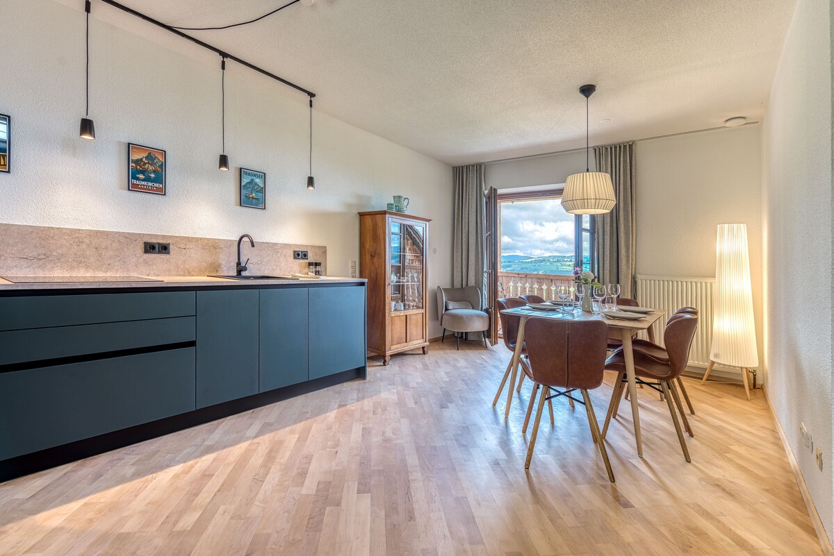 NEUES Apartment mit privater Sauna über zwei Etagen. Im unteren Bereich befindet sich eine Küche mit Essbereich, ein Balkon, eine Terrasse, ein Badezimmer und ein WC. Über eine Treppe erreicht man eine offene Galerie. Dort befindet sich ein Doppelbett und 2 Schlafsofas. Von diesem Raum kommt man in ein abgetrenntes Zimmer mit 2 Einzelbetten. Das Apartment in ruhiger Lage bietet eine traumhafte Aussicht. Nur 4 km vom See entfernt, ist es der perfekte Ausgangspunkt für Wanderungen und Radtouren.
