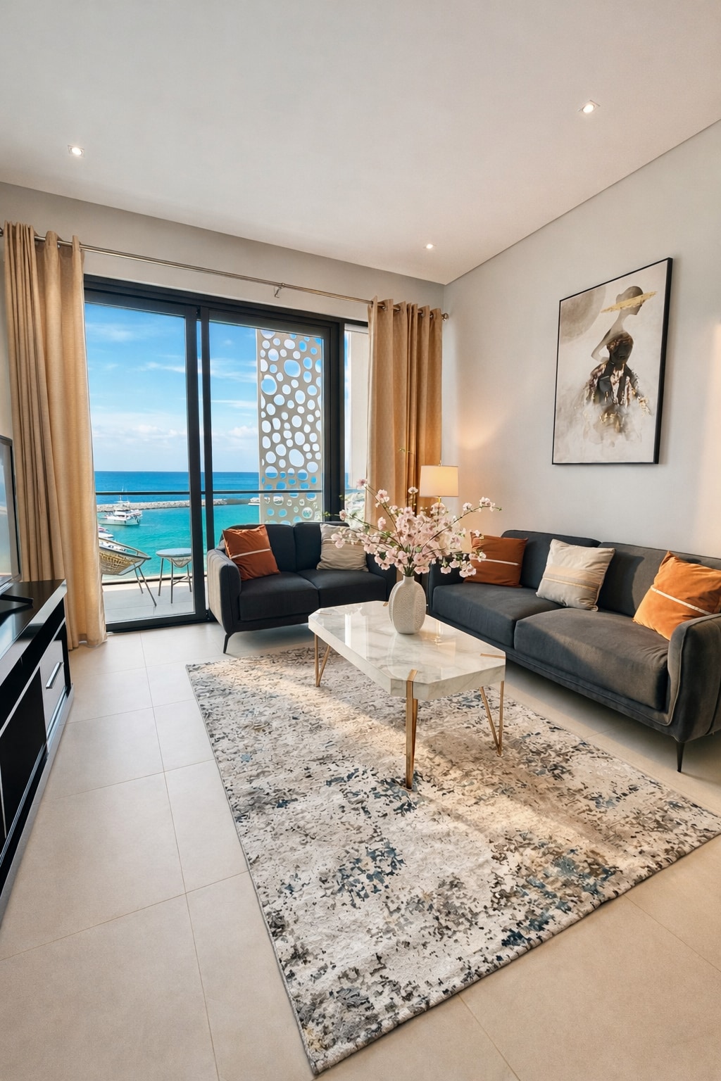 Willkommen in deiner luxuriösen 2BHK-Wohnung mit Blick auf den Yachthafen und das Meer. Genieße ein stilvolles Wohnzimmer mit gemütlichen Sofas und großen Fenstern. Die Küche und der Essbereich sind perfekt für Mahlzeiten mit Aussicht. Entspanne dich in zwei gemütlichen Schlafzimmern und erfrische dich in modernen Badezimmern. Gehen Sie auf die geräumige Terrasse – ideal für Kaffee oder Momente bei Sonnenuntergang. Tauche ein in den Infinity-Pool und genieße die erstklassige Ausstattung. Deine ruhige Unterkunft am Meer wartet auf dich.