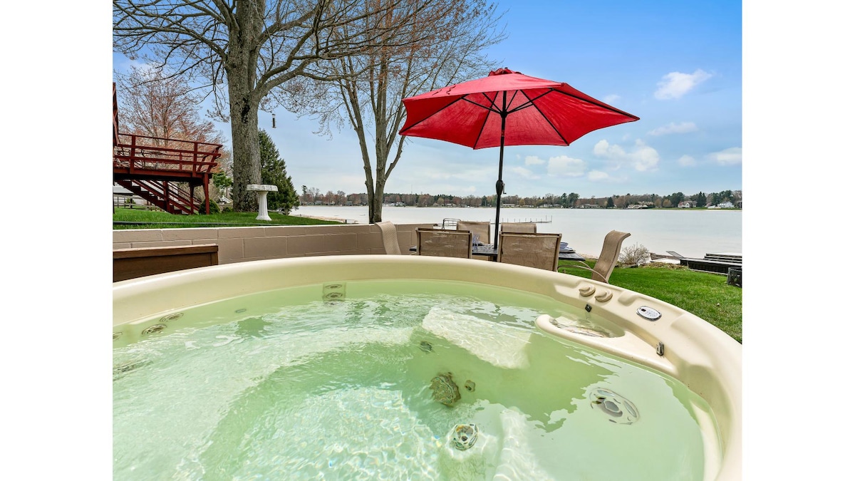 Entfliehe in dieses private, ruhige Refugium für Familien – perfekt für große Gruppen! Schlafplätze für mehr als 17 Personen in zwei separaten, modernen Gebäuden aus der Mitte des Jahrhunderts, jedes mit eigener Küche und Wohnbereich. Genieße 76 m Sandstrand, kristallklares Wasser, einen Spielplatz, eine Sauna, einen Whirlpool, Tischtennis, Paddelboards und Kajaks. Entspanne dich im geräumigen Wohnbereich im Freien inmitten der Natur. Ideal, um Erinnerungen zu schaffen, zu entspannen und wieder zusammenzukommen – dein abgeschiedenes Paradies am See erwartet dich! Nur 7 Minuten von Michigan's Adventure entfernt.