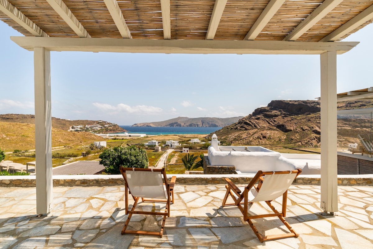 Willkommen in unserer brandneuen Villa am Wasser!! Sie befindet sich im luxuriösen Teil der Insel in der Gegend von Kalafatis, nur 4 Gehminuten vom Strand entfernt. Mache deinen Aufenthalt unvergesslich und genieße die besten Sonnenuntergänge und den Meerblick von deinem privaten Pool aus. 4 Schlafzimmer, alle mit eigenem Bad und Klimaanlage. Luxus trifft auf traditionellen Stil, damit du dich wie zuhause fühlst. 5–10 Minuten Fahrt von Ano Mera, Märkten und den meisten südlichen Stränden entfernt. Wir arrangieren auch jede Art von Service wie privaten Transport rund um die Uhr.