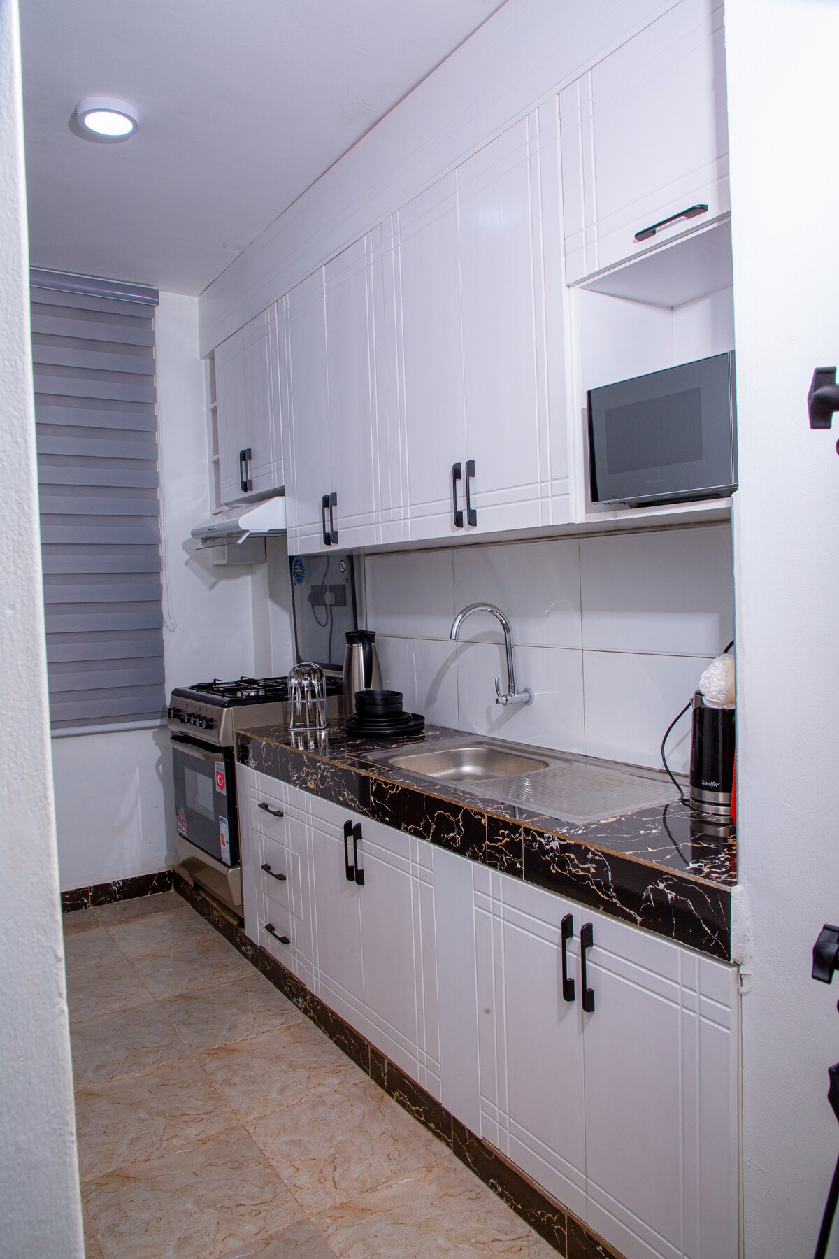 Das Studio ist komplett möbliert, Selbstversorger mit KOSTENLOSEM GLASFASER-WLAN, unbegrenztem KOSTENLOSEM PARKPLATZ. Das Hotel liegt in einer ummauerten, geschlossenen Anlage mit einem 27/7 zertifizierten Wachmann, in einem ruhigen, wohlhabenden Wohnviertel im zentralen Bezirk Kampala. Es ist modern, stilvoll, gemütlich, staubfrei, mit einem Hausmeister und 24-Stunden-Überwachung. Neben Nakawa, viele Restaurants, Bars und Kino im Umkreis von 5 Meilen und 11 Minuten zum Carrefour-Markt und Oasis Mall. 0,5 Meilen zur Kyambogo University und 11 Minuten zum Lugogo-Stadion.