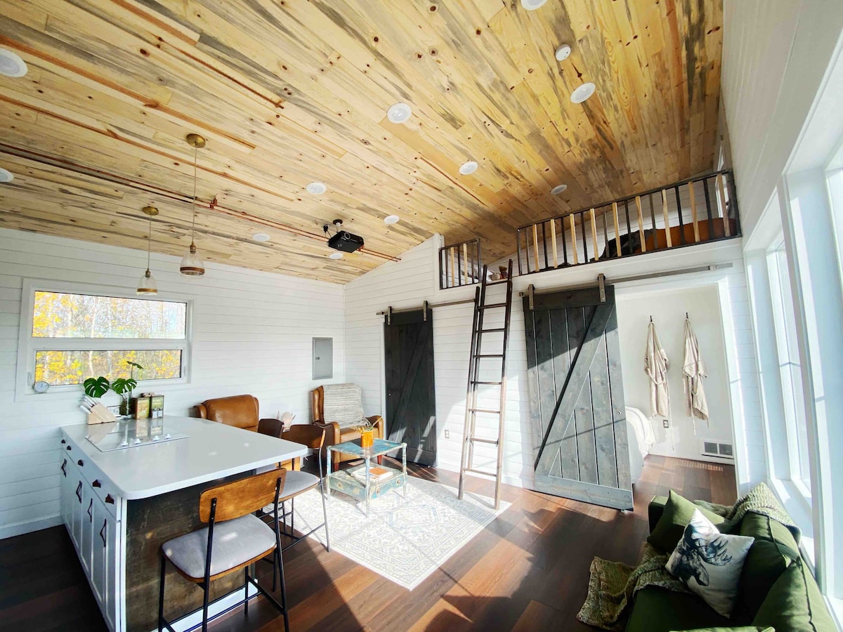 Eine „kleine Hütte“, es gibt 1 volles Bett. Kein Schlafsofa. Die Küchentheken sind renovierte alte Scheunentüren, die lange Wand ist Palettenholz, die Holzböden wurden für einen rustikalen Look angebrannt und versiegelt. Die Hütte ist 12 x 20, perfekt für zwei Gäste und ein kleines Kind kann auf dem Zweiersofa schlafen (kein Ausziehsofa). Es gibt ein volles Bett in der Hütte. Es ist eine trockene Hütte (keine Möglichkeit zum Duschen). Wir stellen ein Wasser-System (5-Gallonen-Krug) zum Auffrischen und abgefülltes Wasser im Kühlschrank zur Verfügung.