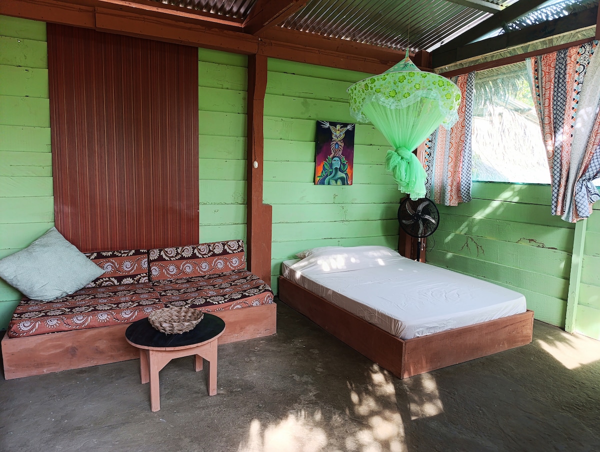 Dieses einzigartige Haus mit 360-Grad-Blick auf den schönen Garten ist luftig und geräumig. Mit einem Doppelbett, einem Einzelbett und einer Futon-Couch ist es geräumig genug für die ganze Gruppe. Mit Zugang zu einem gemeinsamen Hängematten-Salon, einer Küche und einem Badezimmer hast du alles, was du benötigst, um dich wohlzufühlen und deinen Aufenthalt zu genießen, einschließlich 24-Stunden-Zugang zu Highspeed-Internet.