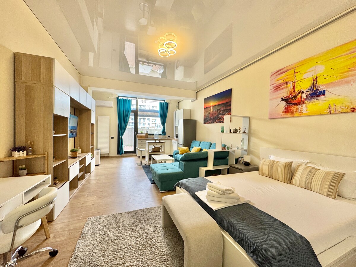 🌅⛵Wir bieten den perfekten Ort für einen Traumurlaub!!! 🎈🚣♂️ Luxuriöses, kompaktes, erschwingliches, geräumiges Studio, bietet Platz für 4 Personen. Sie liegt in Mamaia nördlich an der Promenade, 1 Gehminute vom Strand entfernt, in der Nähe des Gebäudes Stefan Resort (ein wichtiger Attraktionspunkt). Das Studio liegt neben dem Gebäude Stefan Resort, dem neuesten und modernsten Komplex am Meer! Nur 5 Autominuten vom Zentrum von Mamaia und 4 Autominuten vom Loft, Nuba, Brezze, Crazy, Ego, Fratelli Cubes entfernt.