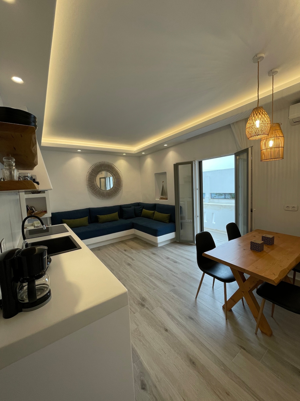 This Island Suite is an inextricable part of "Georgilas Cave House". At the time when GCH was a lively farm, “Rosy Ipostatiko”; along with its twin "Velvet Ipostatiko", were serving as warehouses for the storage of the farm's production. Today, they have been converted into two picturesque Cycladic studios, which can perfectly accommodate couples which seek romance, relaxation, privacy and comfort, as well as young parents!